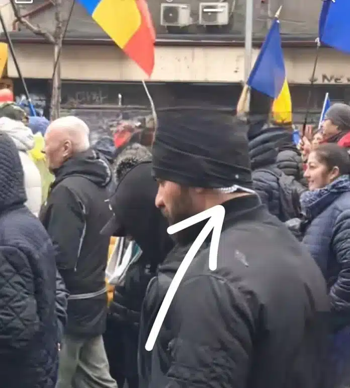 Zară a atașat mesajului său și o fotografie despre care susține că reprezintă un fals manifestant pro-Georgescu,cu o cască folosită de serviciile de securitate mascată sub fes, prezent printre manifestanți la mitingul din 1 martie din București.