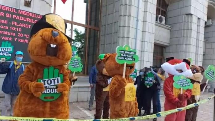 Câțiva membri ai comunității Declic s-au deghizat în animale de pădure și i-au cerut ministrului Mediului, Tanczos Barna, să ia mai multe măsuri împotriva tăierilor ilegale de copaci.