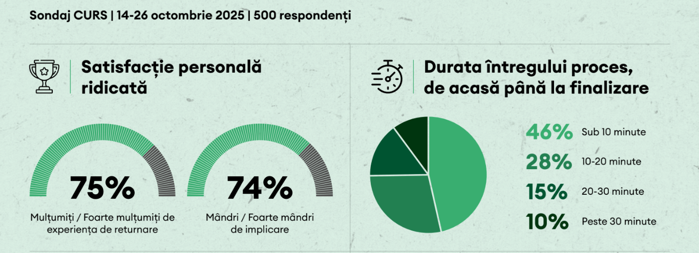 La aproape doi ani de la lansarea Sistemului de Garanție-Returnare, un studiu CURS arată o schimbare vizibilă în felul în care românii se raportează la ambalajele de băuturi: returnarea a devenit un gest firesc, integrat în ritmul zilnic, iar experiența este una pozitivă pentru majoritatea utilizatorilor. Potrivit sondajului, trei din patru persoane care returnează ambalaje declară că sunt foarte mulțumite sau mulțumite de întregul proces. Rezultatul confirmă faptul că SGR nu este doar o infrastructură de colectare, ci un mecanism care schimbă comportamente și creează noi reflexe de consum responsabil.