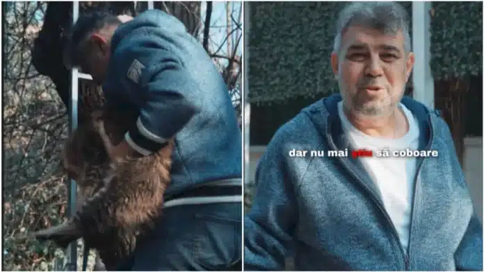 Premierul Marcel Ciolacu s-a urcat astăzi într-un copac pentru a-și salva pisica. Într-un videoclip postat pe TikTok, liderul PSD a explicat că în dimineață a auzit un mieunat în curtea vilei de protocol. Când a ieșit afară, și-a văzut animalul cățărat pe un perete. Pentru că pisica a refuzat să coboare, premierul a luat o scară și s-a urcat într-un copac pentru a-și ajuta pisica speriată să coboare.