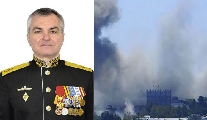 Foto: amiralul Viktor Sokolov (stânga) și explozia care a devastat sediul din Sevastopol al Flotei ruse la Marea Neagră (dreapta)